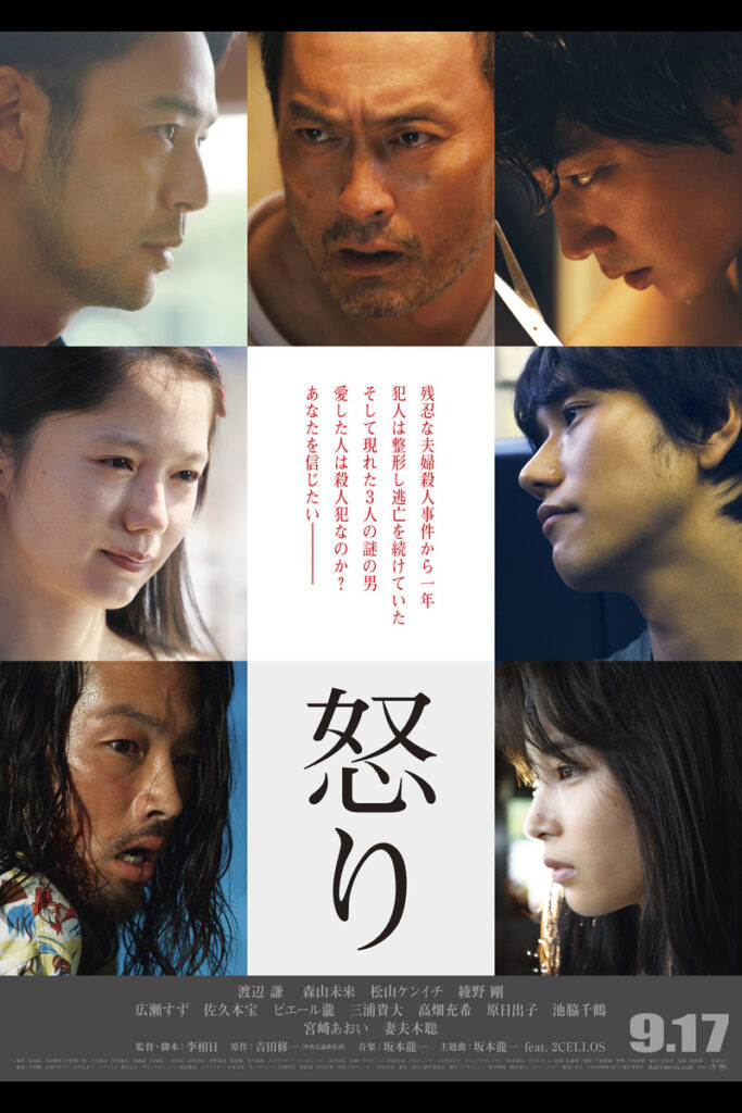 ある夏の暑い日に八王子で夫婦殺人事件が起こった。 窓は閉め切られ、蒸し風呂状態の現場には、『怒』の血文字が残されていた。 犯人は顔を整形し、全国に逃亡を続ける。