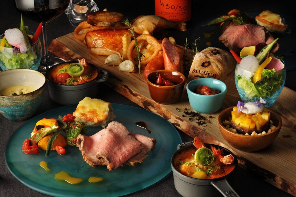 国産牛のローストビーフ、ローストチキン、海老とトマトのグラタン、ラタトゥイユ、サラダ、スープ、マンゴーとパイナップルのフォンダンショコラ