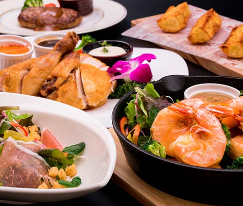 今年のディナーは、ガーリックシュリンプやハンバーグ、特製丸鶏のジューシーフライなど、アラカルトメニューでご用意しております。