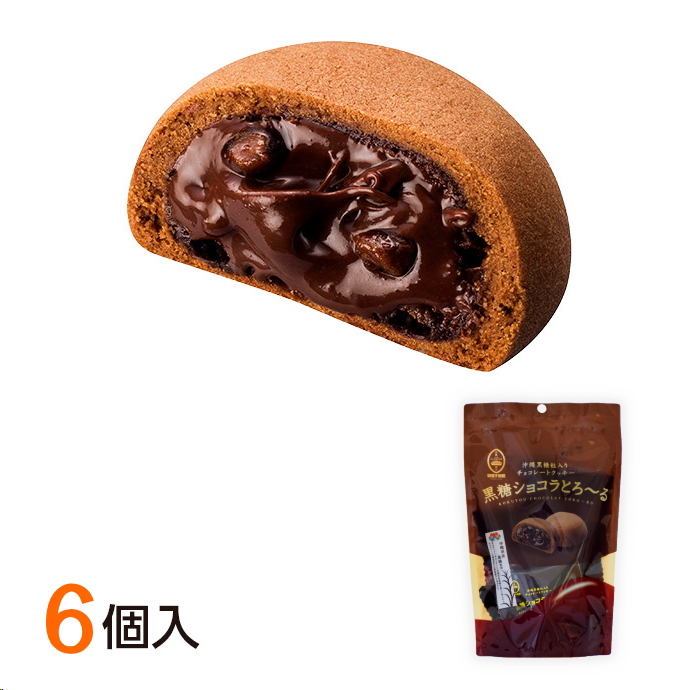 沖縄県産100%加工黒糖と、黒蜜を練り込んだクッキー生地に、とろ〜り食感のチョコレートをたっぷり包みました。チョコレートの中には粒状の加工黒糖が隠れていて、優しい甘さと風味、粒々食感が楽しめるクッキーです。