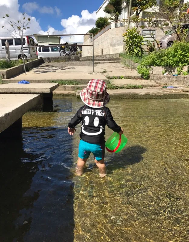 水がとても冷たくて、透明でとても綺麗「かでしがわ」。オタマジャクシや小魚もいるので、子供達は捕まえるのに夢中になります。自然体験ができる嘉手志川は幼児の体験型知育にも最適。