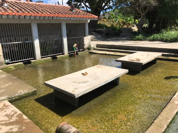 糸満市の透明な湧き水が流れ込む水場「嘉手志川」。