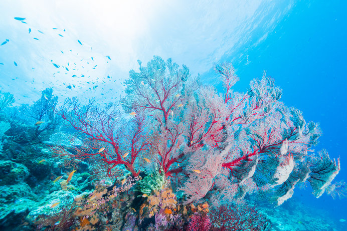 全世界のサンゴ450種のうち、400種が沖縄に生息しているます。通常サンゴは、人気の少ない海にいますが、沖縄では、100万人以上の人が住んでいるすぐ近くにサンゴが生きています。これは地球上でも珍しい自然環境です。