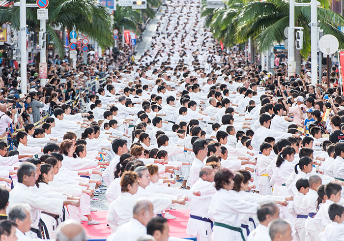2005年以降、沖縄では「空手の日」にあわせて多くのイベントが開催されています。その一つが「空手の日 記念演武祭」です。2014年には約1,000人、2015年には約2,500人が参加し、2016年の記念演武祭には約4,000人の国内外の空手家・空手愛好者が国際通りで演武を披露しました。総勢約4,000人の参加者のうち3,973人が成功し、2013年8月3日にインドで達成された809人の記録を大幅に塗り替え、空手の集団演武でギネス新記録を樹立しました。
